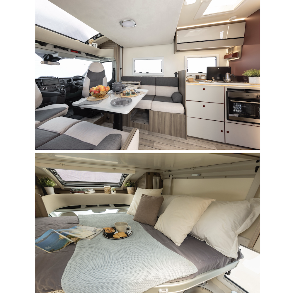 The Roller Team Kronos Compact motorhome is very similar to campervans with compact dimensions, making it easy to park. Inside the motorhome, the living environment gives you everything you need in terms of space and a social life. The Kronos Compact provides the thermal insulation and comfort of a low-profile vehicle with the interior layout, height of the room, easy access and a large refrigerator. You will find a spacious dinette that offers comfortable seating, extendable or rotating tables and swivel seats.