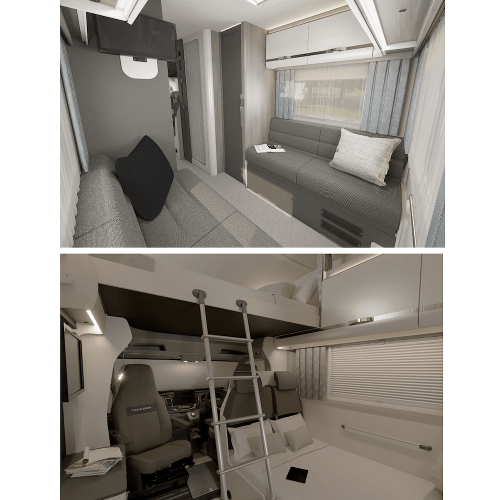 Built on a Ford chassis for travelling peace of mind, the Voyager 4 Series has been designed for families who love to explore. With a refined and sleek interior, Voyager 4 Series maximises space without compromising on design or on-board amenities. With 3 layouts available, the 475 with a rear lounge, the 485 with single beds and 494 with an island bed, there is a layout for everyone. Each 4 Series Voyager comes with an over cab bed and fixed traveling seats. View the full Voyager 4 Series specification here.