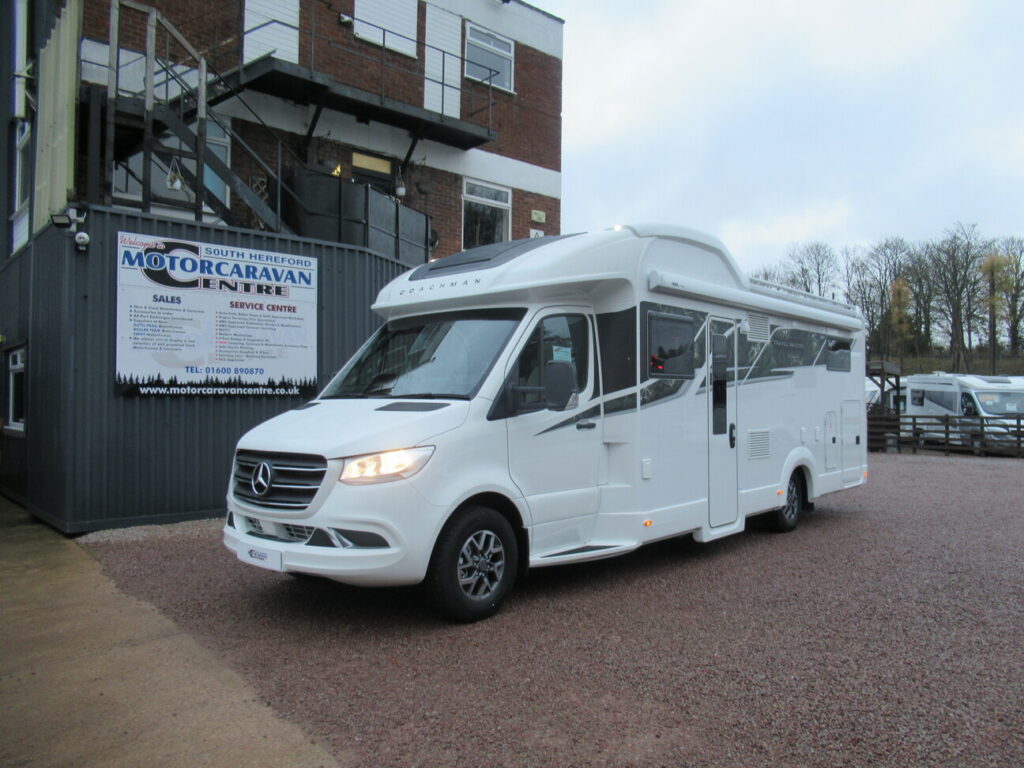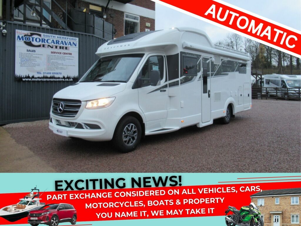 This Coachman motorhome provides 4 berth accommodation, with 4 belted seats (including drivers). With accommodation provided through a twin single beds and electric drop-down bed over the front lounge. While the kitchen benefits from a 2-burner gas hob, combined oven & grill, microwave, 3-way fridge/freezer and sink. Also, the bathroom has a separate shower washroom with shower, sink, vanity, and cassette toilet.