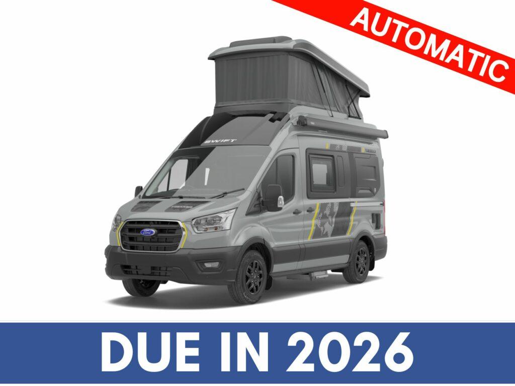 This Swift motorhome provides 4 berth accommodation, with 4 belted seats (including drivers). With accommodation provided through high level fold down beds at the rear, and a pop top roof double bed. While the kitchen benefits from a 2-burner gas hob, compressor fridge/freezer and sink. The bathroom has a combined washroom with shower, sink, vanity, and cassette toilet.
