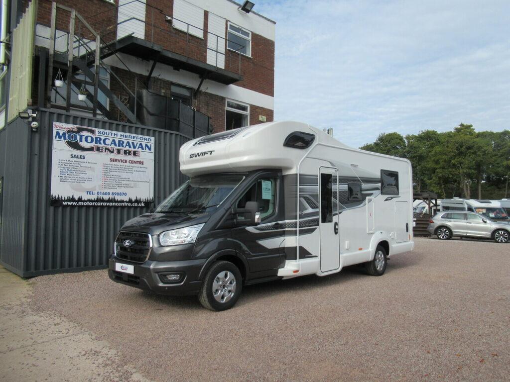 This Swift motorhome provides 4 berth accommodation, with 4 belted seats (including drivers). With accommodation provided through an island bed and an over cab bed. While the kitchen benefits from a dual fuel hob, combined oven & grill, 3-way fridge/freezer and sink. The bathroom has a combined washroom with shower, sink, vanity, and cassette toilet.
